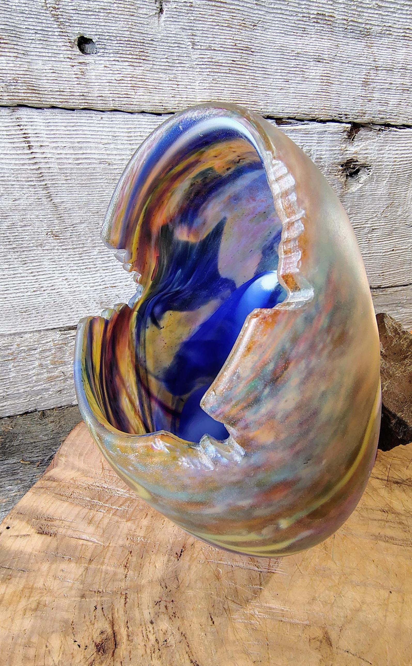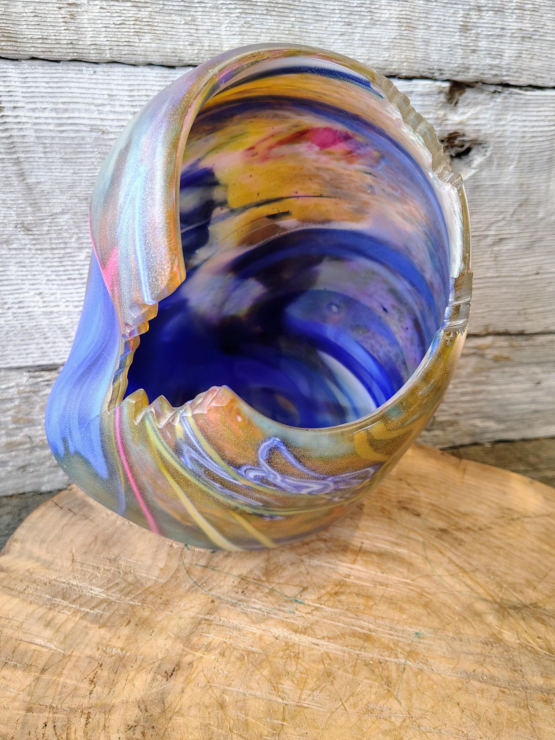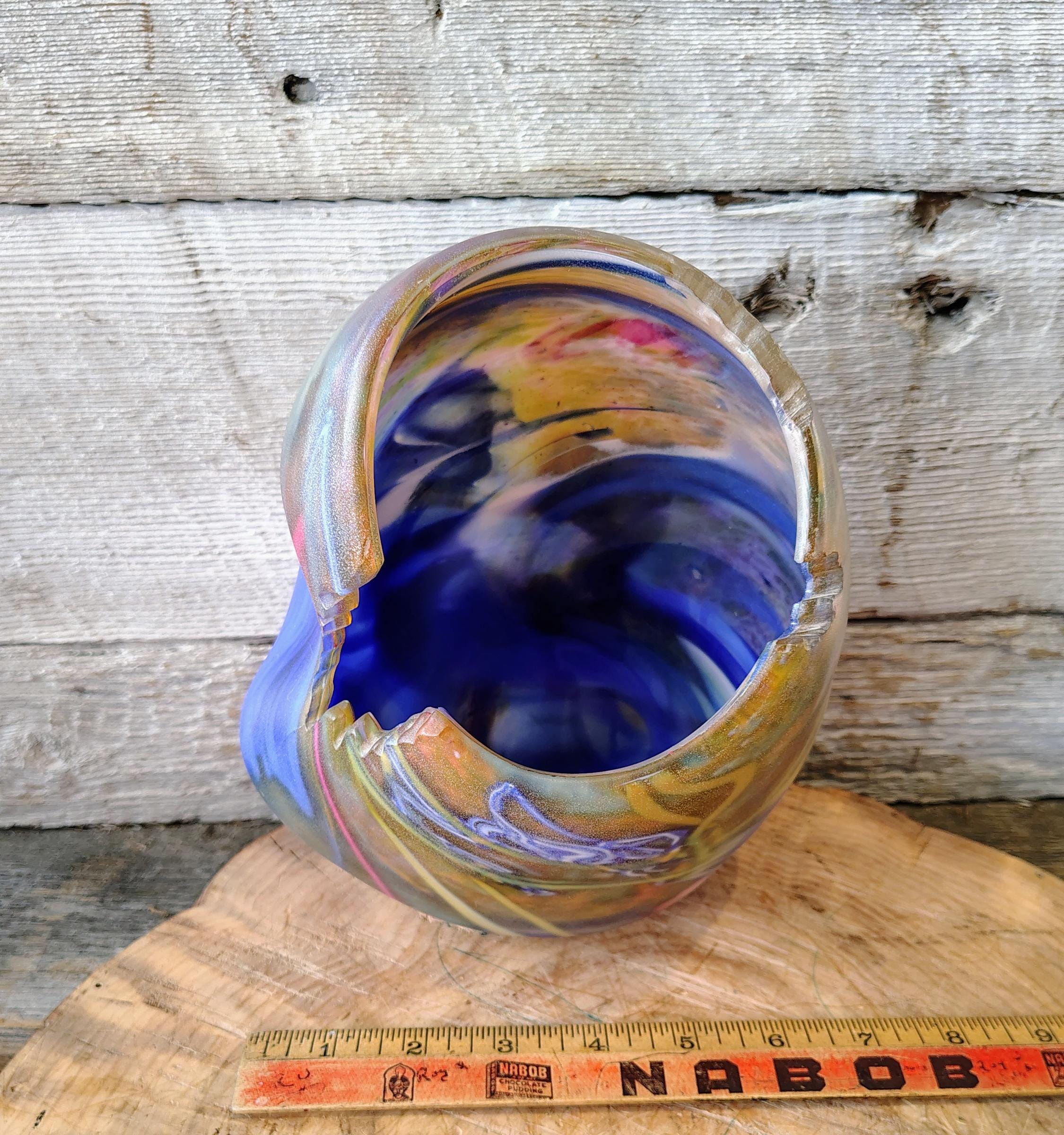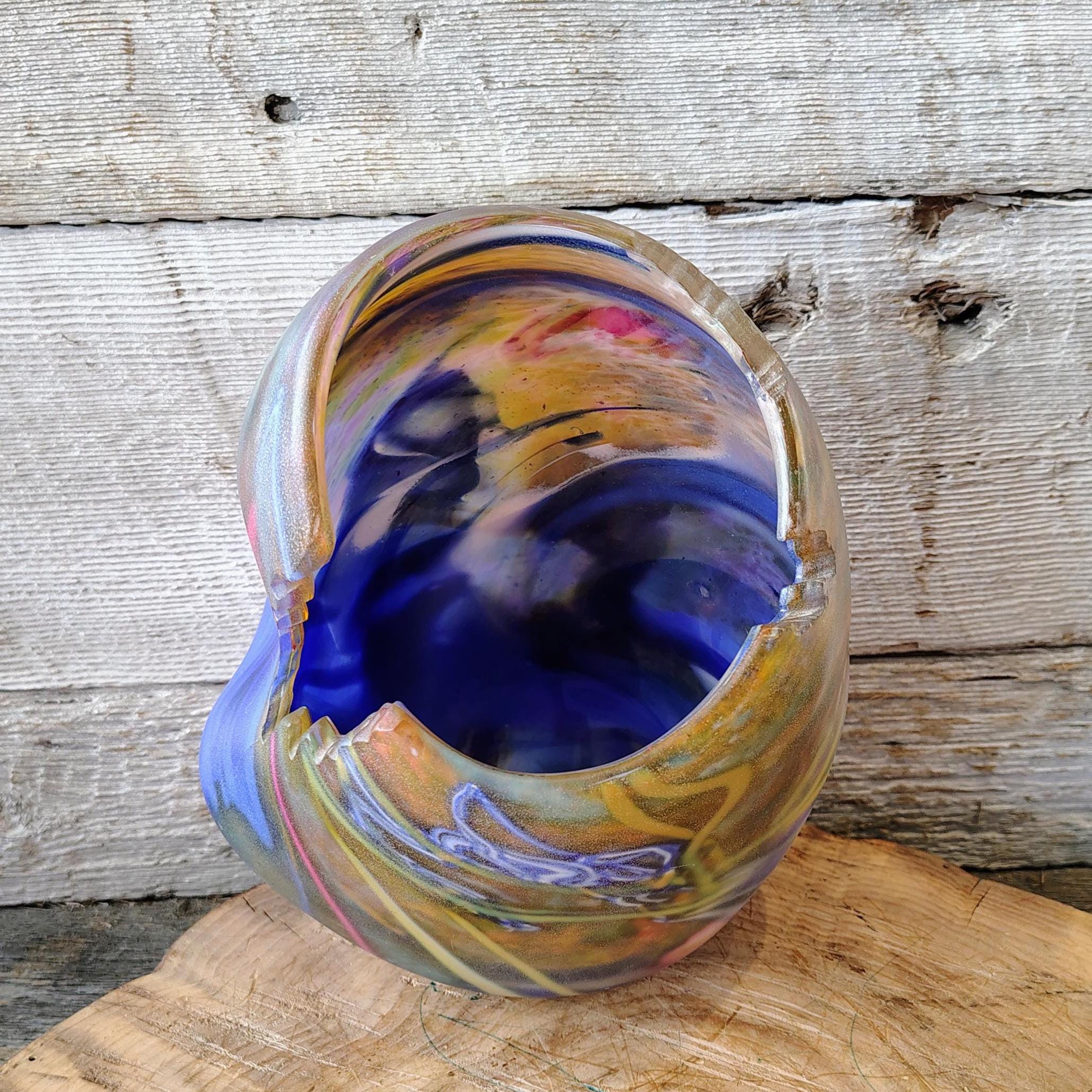 This piece features Kaufmanâs unmistakable sculptural vocabulary: an organic, asymmetrical pod-like form with a jagged carved rim, a deep cobalt-blue interior, and a soft matte/iridescent exterior. Swirls of gold, lavender, green, smoky blue, and blush drift across the surface, while pale blue and white trails wrap the body in flowing abstract lines. The contrast between the glossy interior and the satin exterior gives the entire vessel a luminous presence.