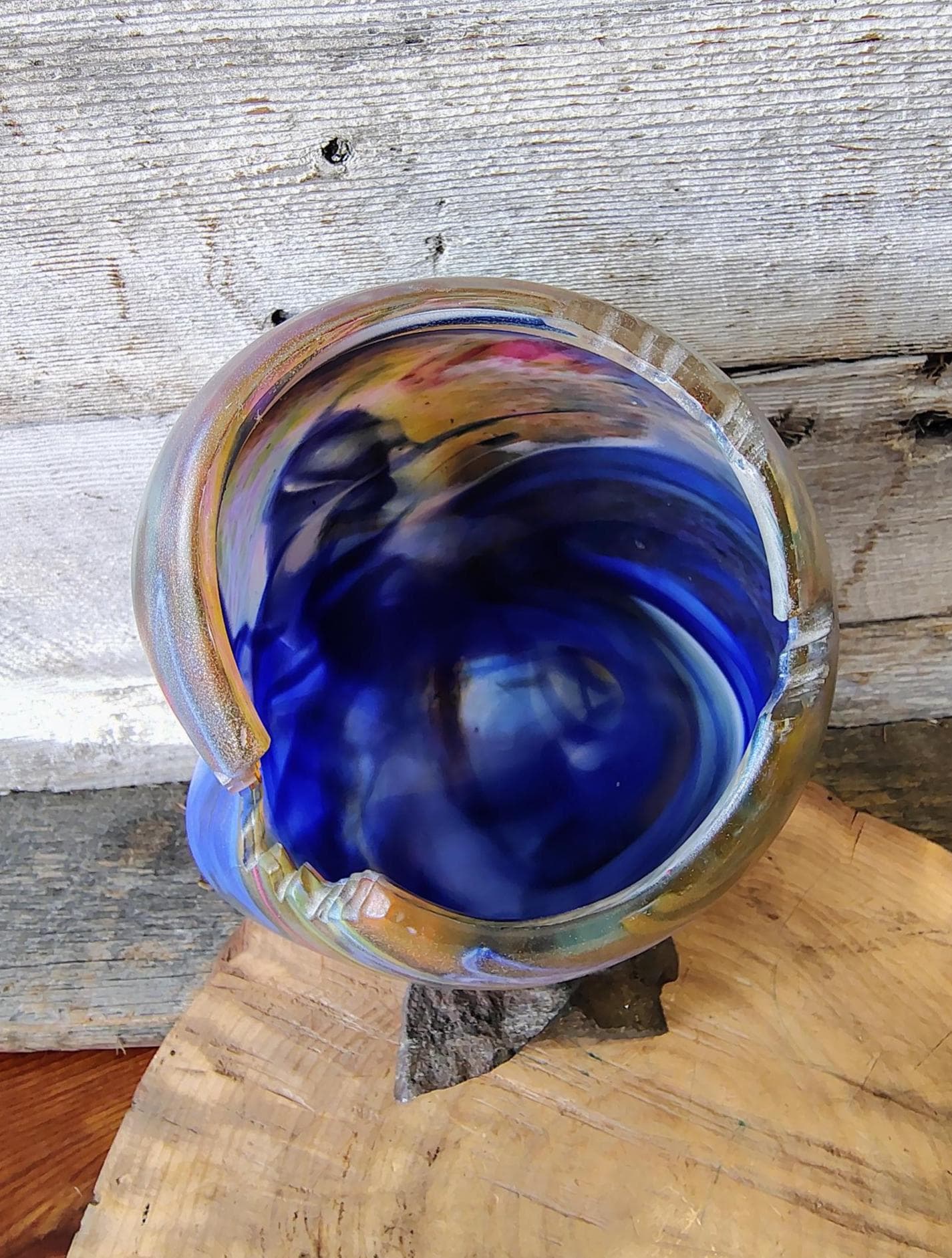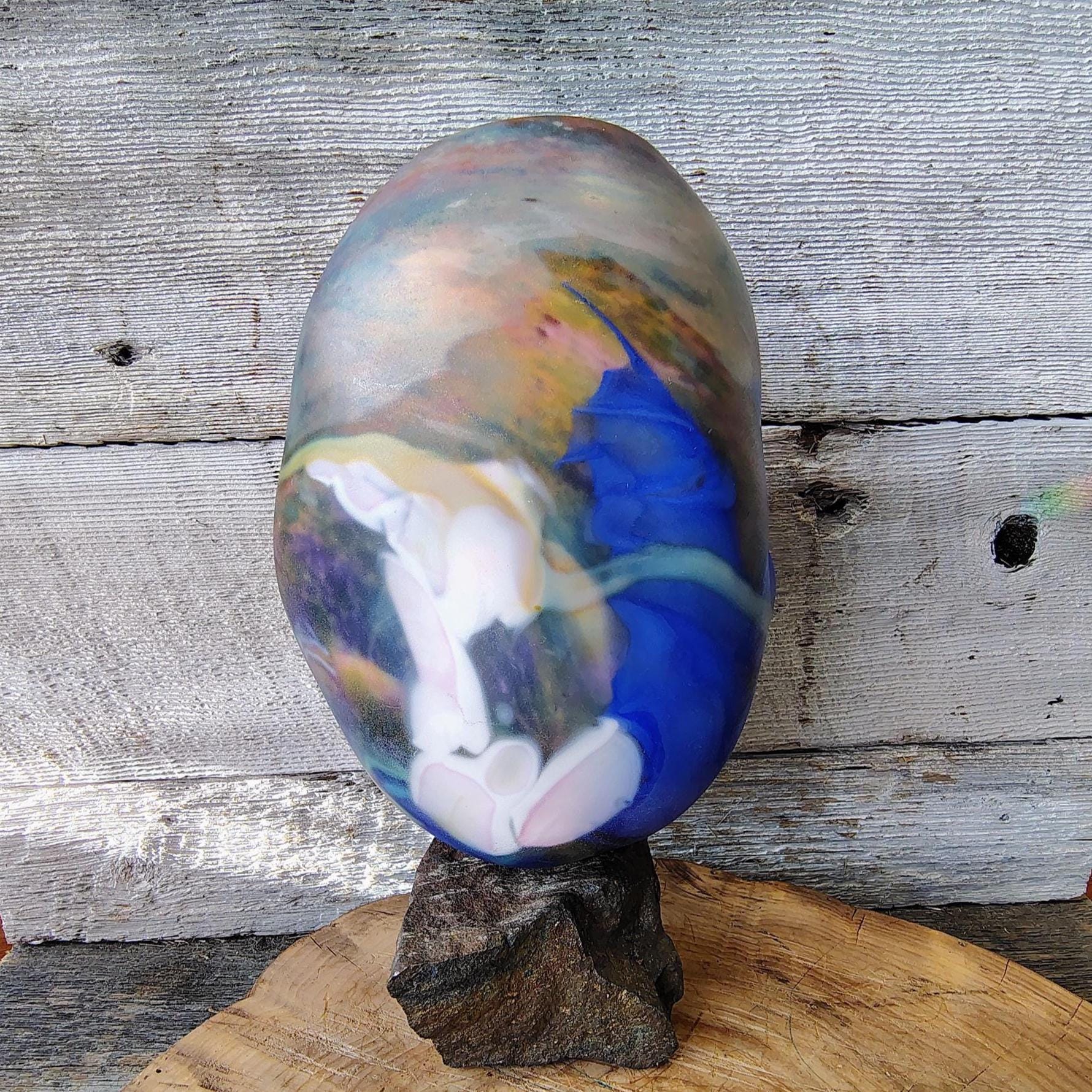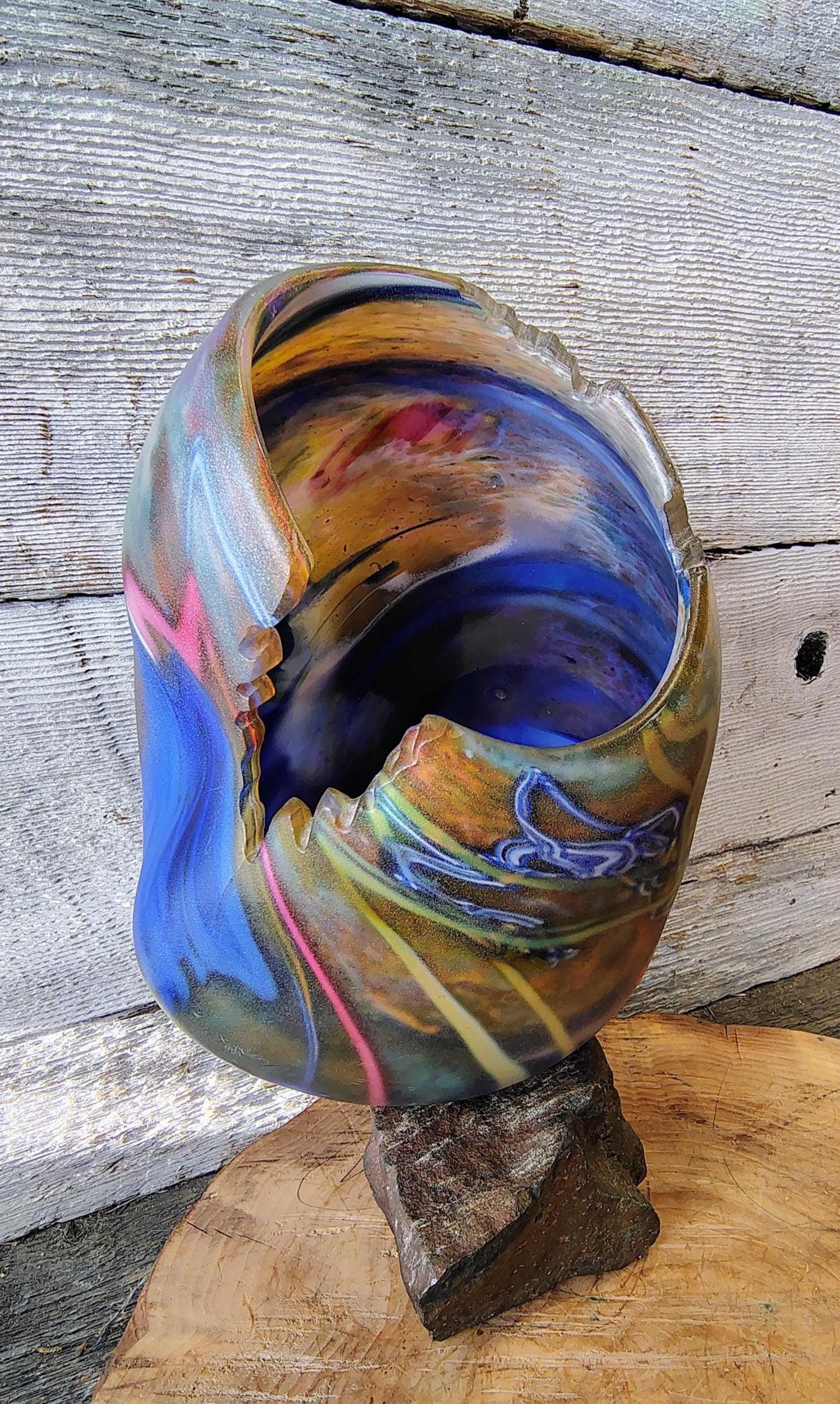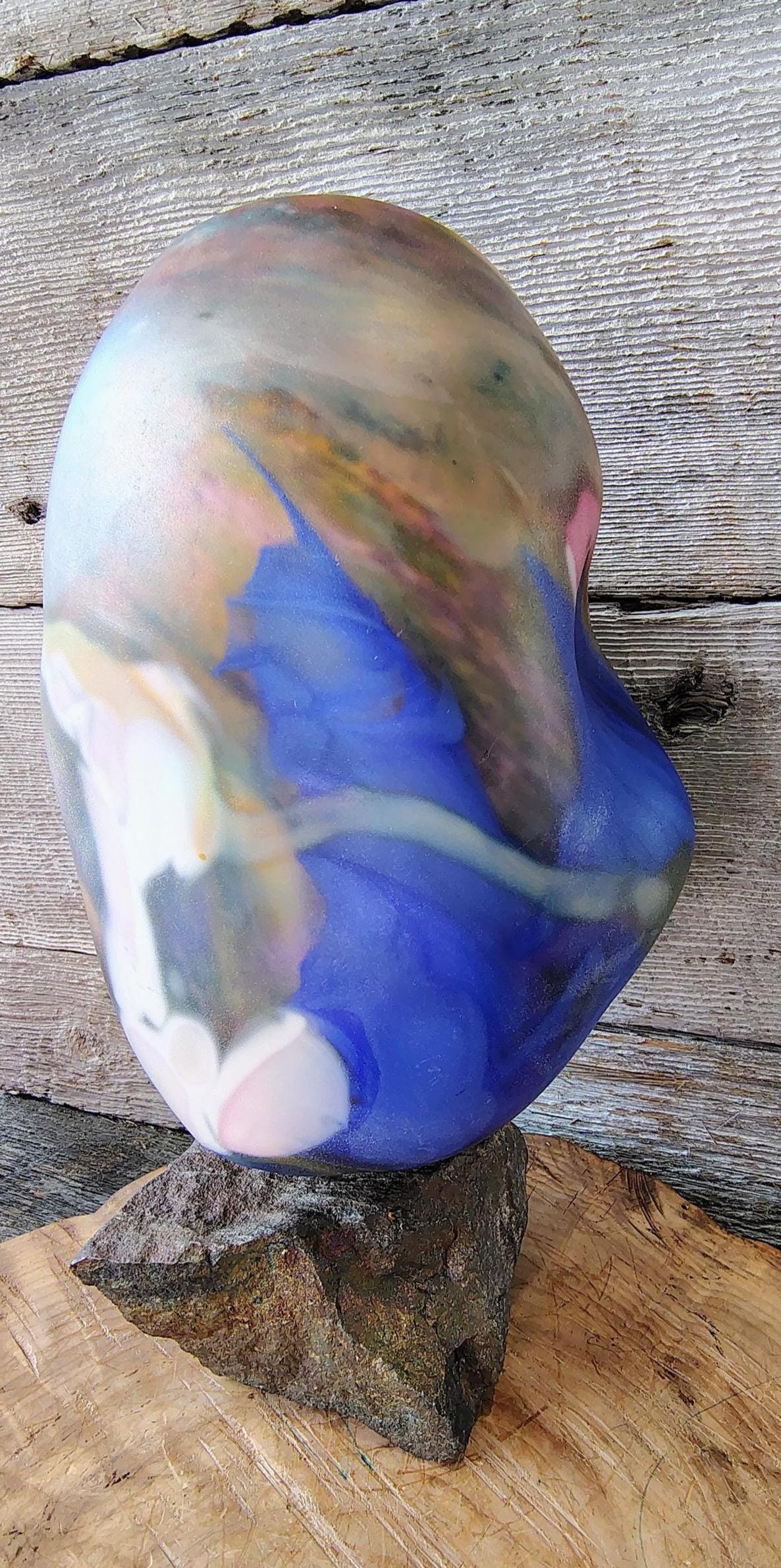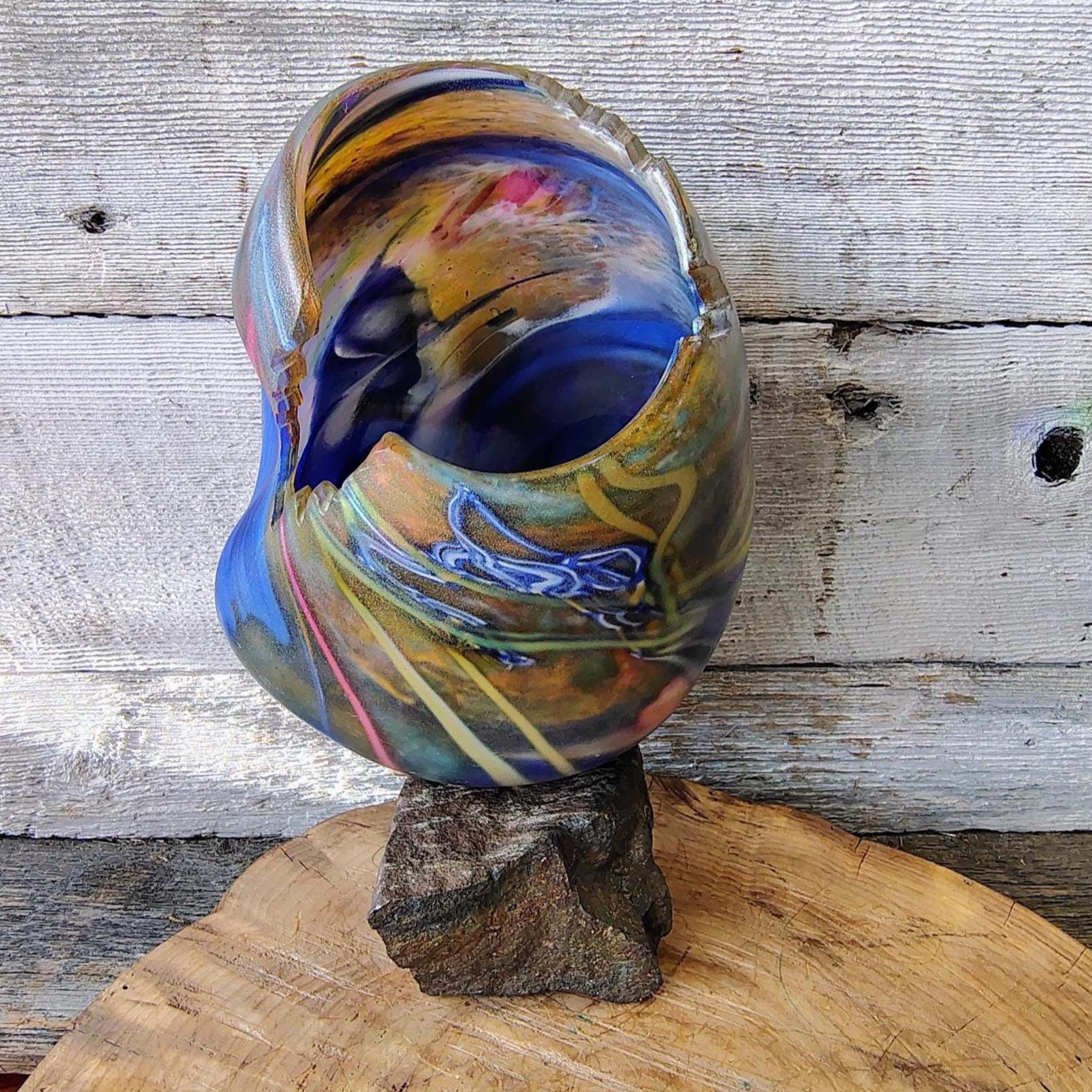 This piece features Kaufmanâs unmistakable sculptural vocabulary: an organic, asymmetrical pod-like form with a jagged carved rim, a deep cobalt-blue interior, and a soft matte/iridescent exterior. Swirls of gold, lavender, green, smoky blue, and blush drift across the surface, while pale blue and white trails wrap the body in flowing abstract lines. The contrast between the glossy interior and the satin exterior gives the entire vessel a luminous presence.