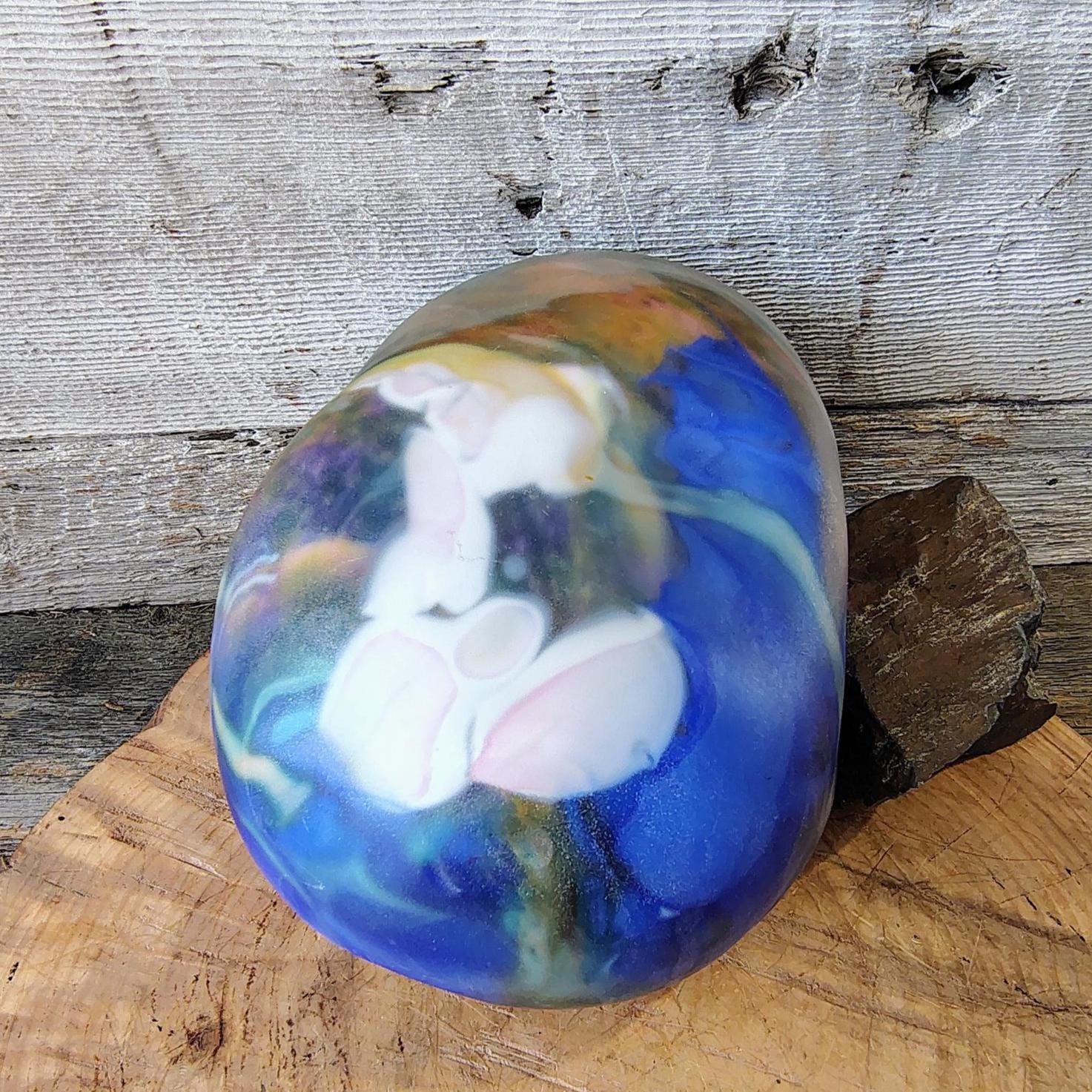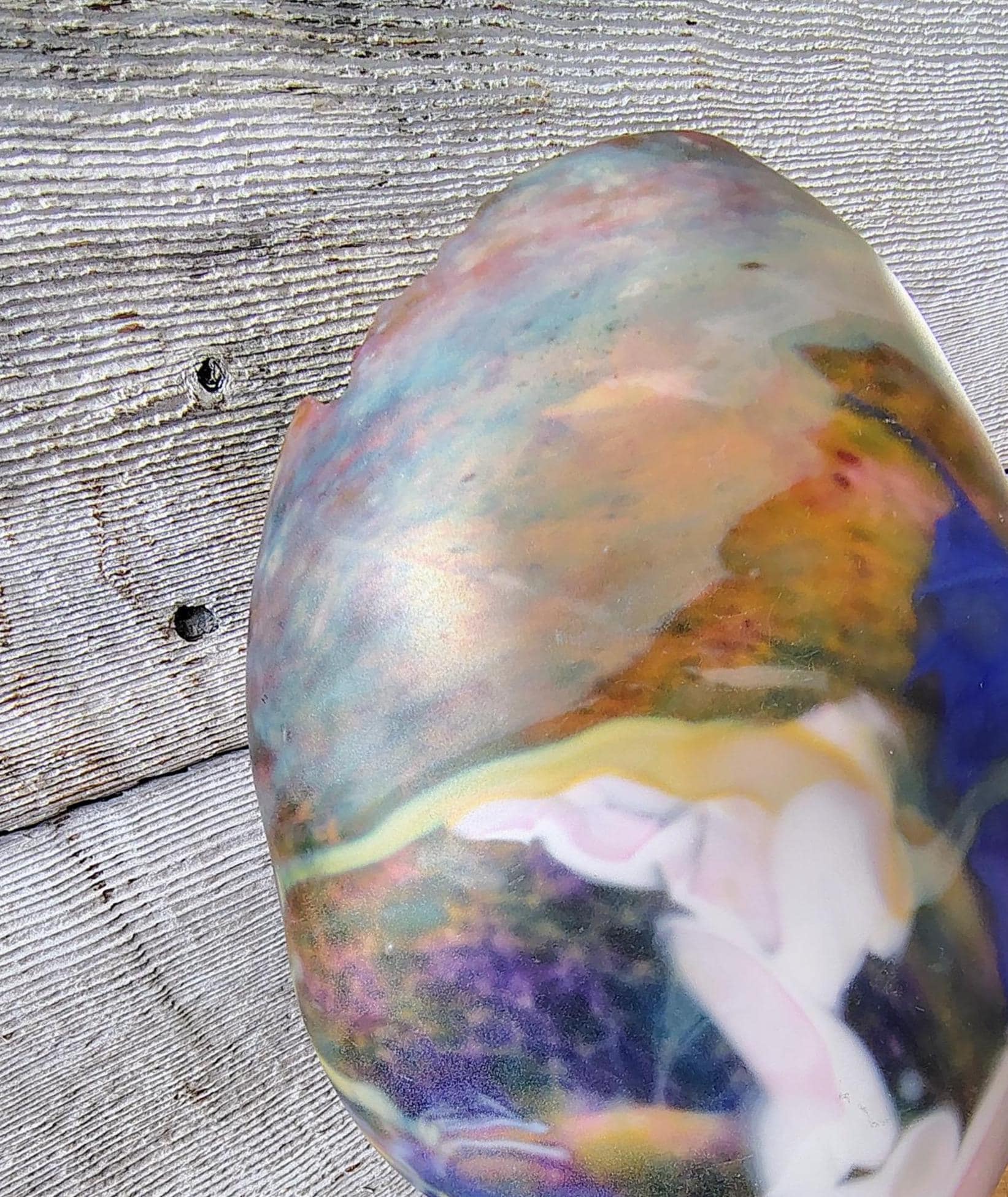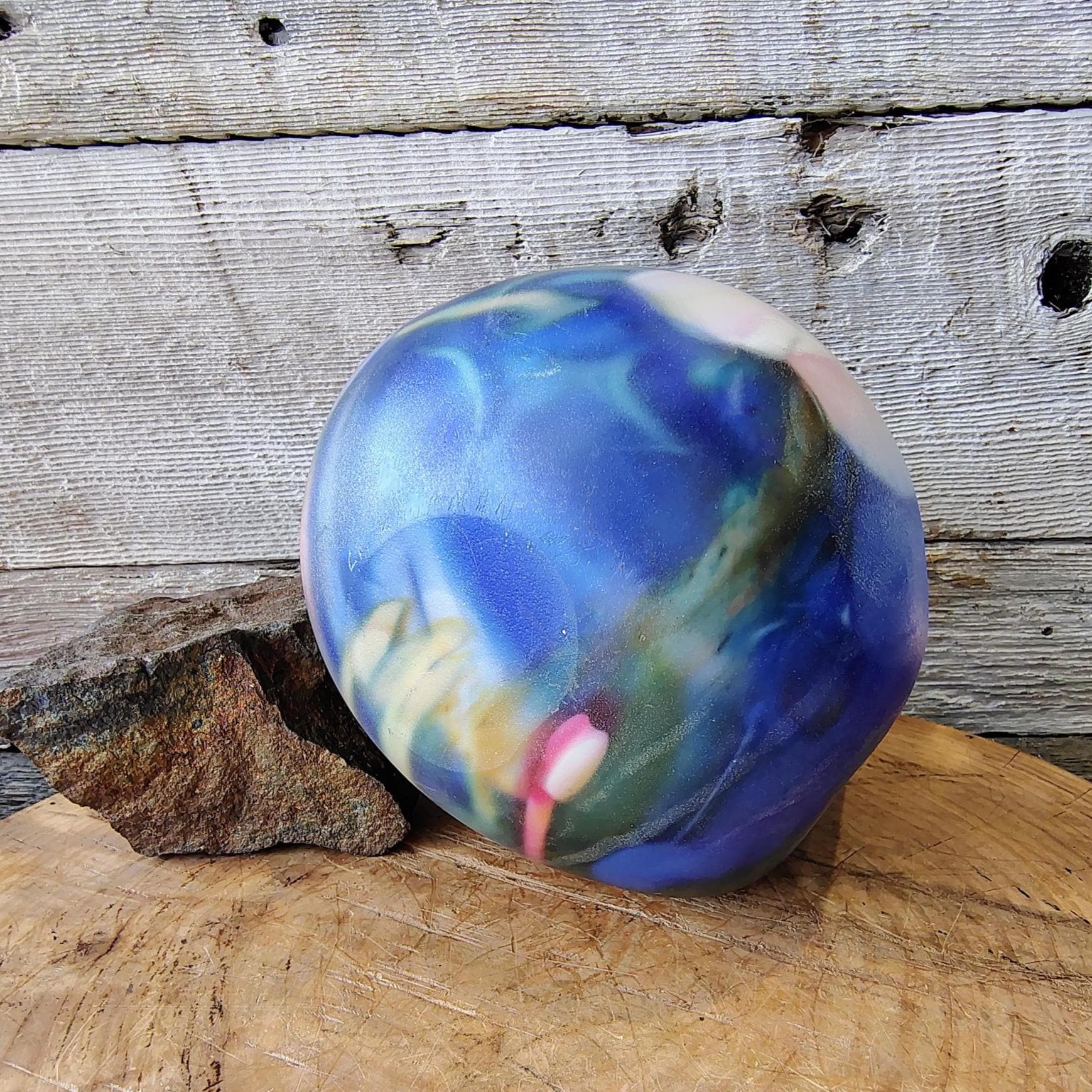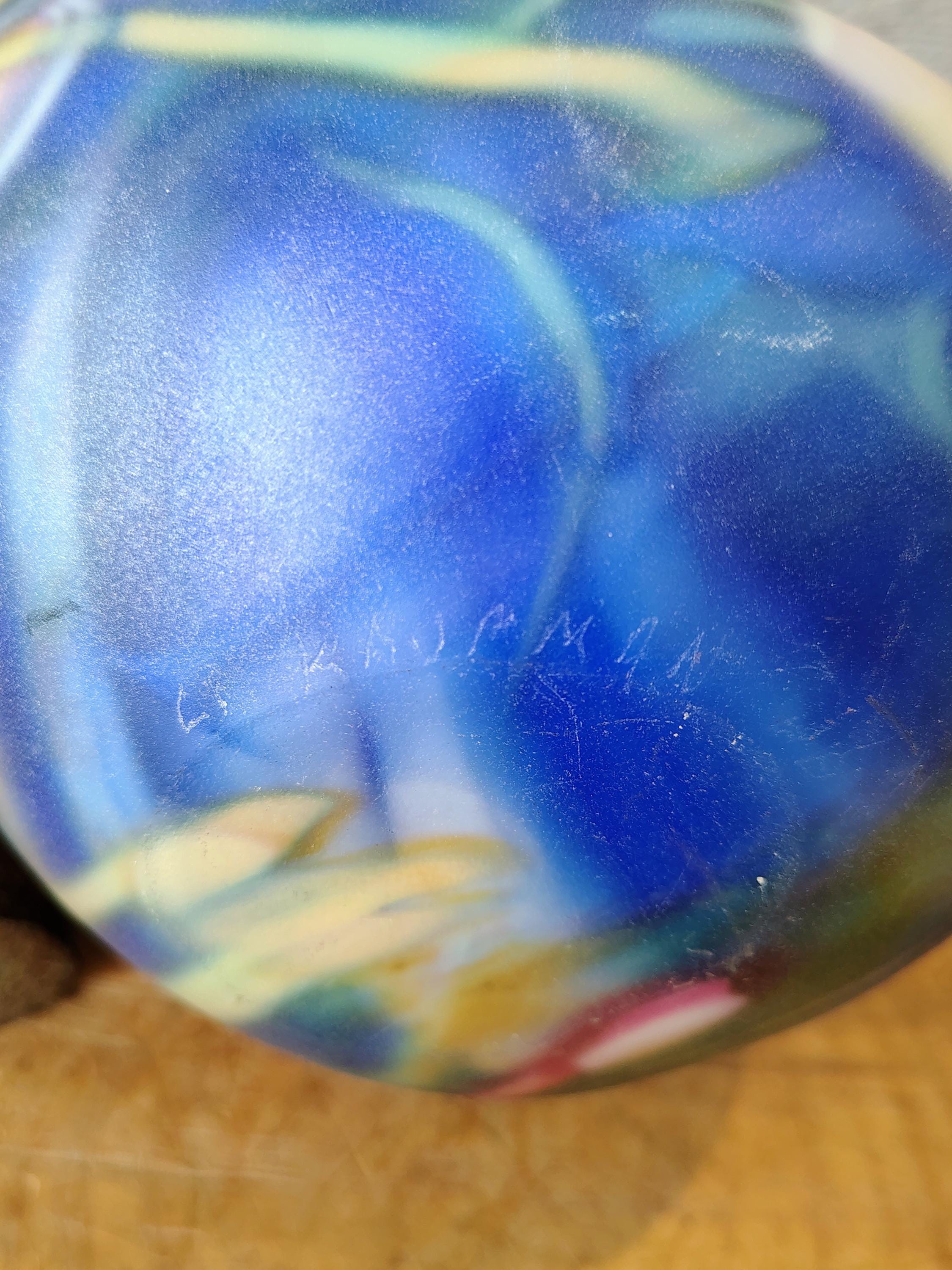This piece features Kaufmanâs unmistakable sculptural vocabulary: an organic, asymmetrical pod-like form with a jagged carved rim, a deep cobalt-blue interior, and a soft matte/iridescent exterior. Swirls of gold, lavender, green, smoky blue, and blush drift across the surface, while pale blue and white trails wrap the body in flowing abstract lines. The contrast between the glossy interior and the satin exterior gives the entire vessel a luminous presence.