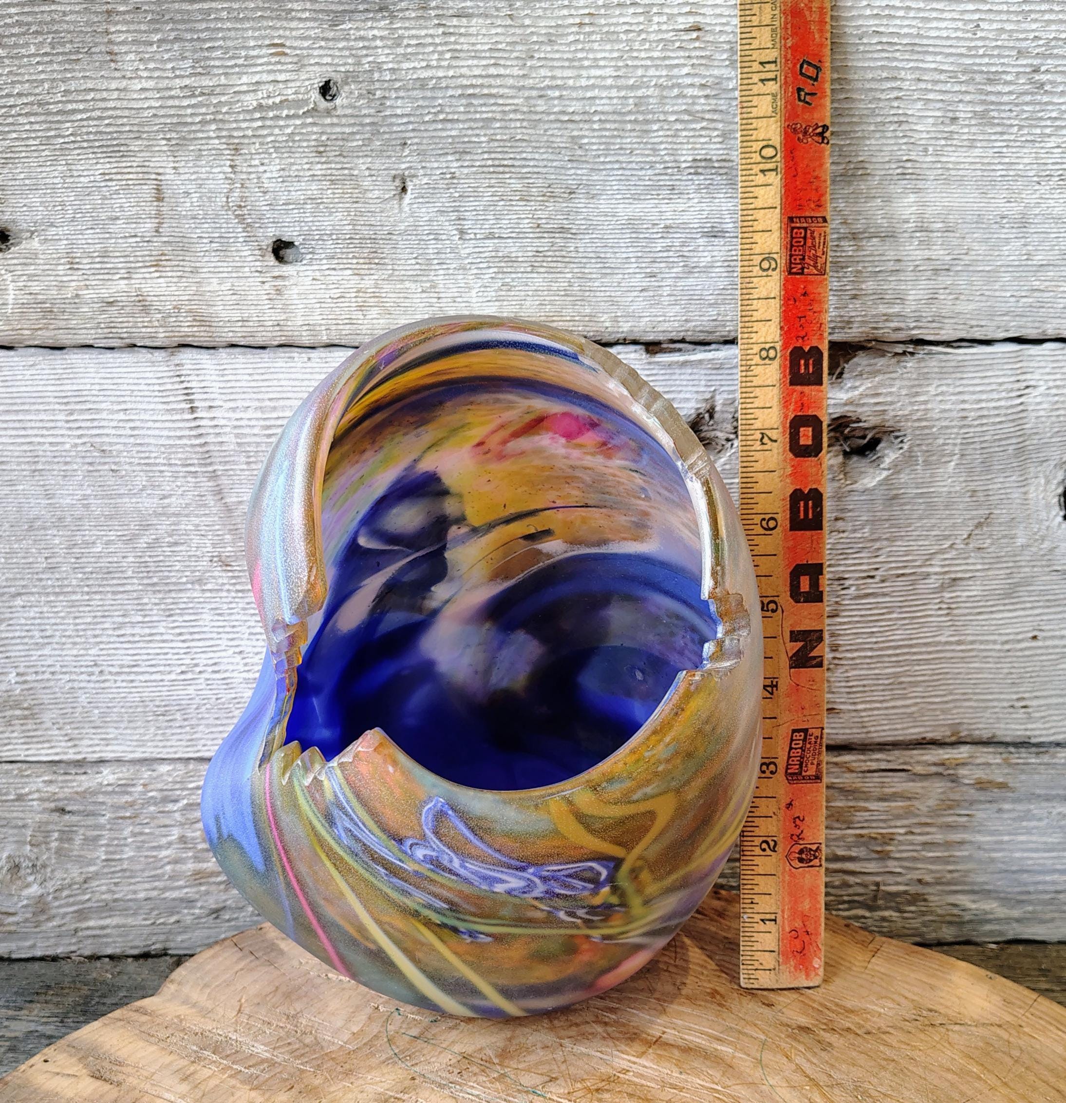 Excellent studio-glass condition. No cracks or repairs. The irregular jagged rim is original to the design, not damage. Light surface wear and faint scuffs on the satin exterior and base from normal display. Colors remain vivid, and the form is wonderfully sculptural with strong visual impact.