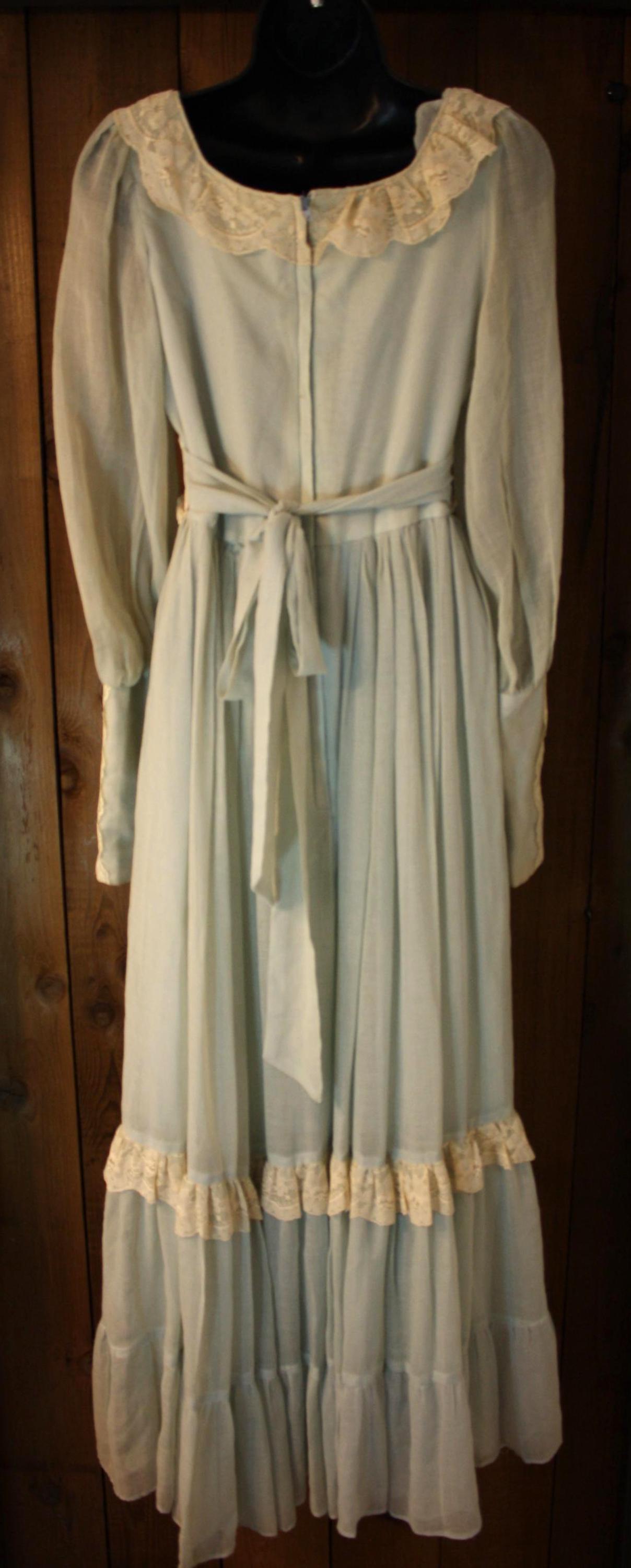 Vintage 1970s powder blue lace prairie maxi dress by Gunne Sax by Jessica, size 11 (XS/S), sheer sleeves, tiered skirt.