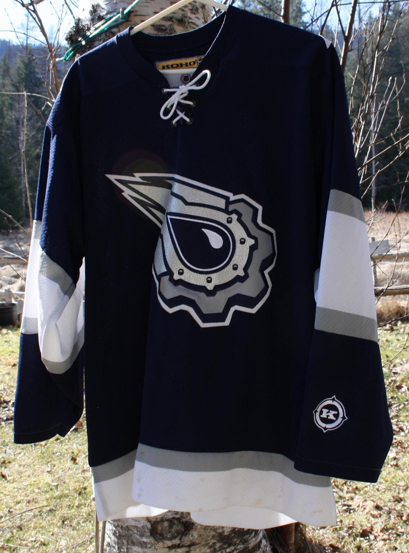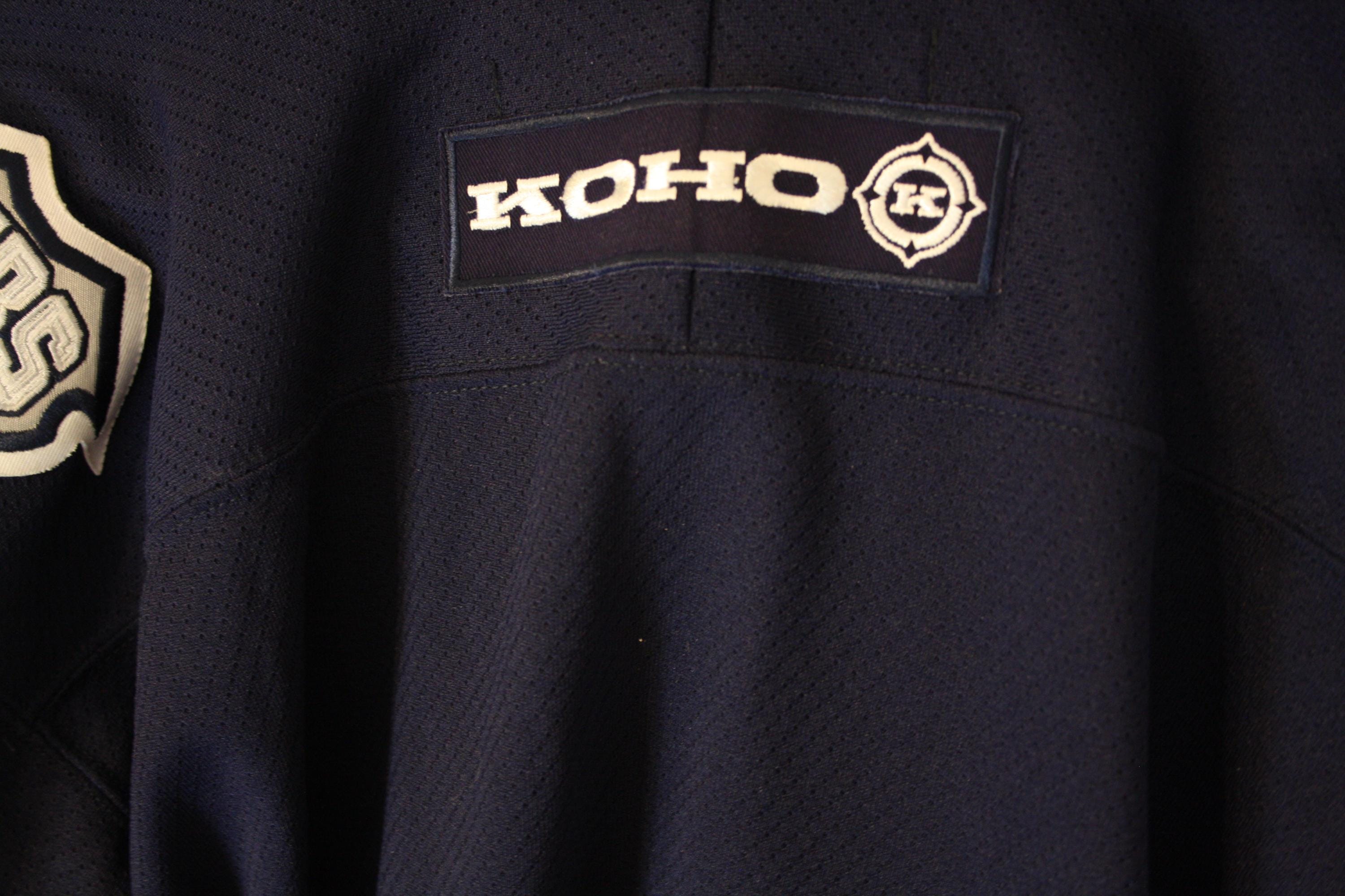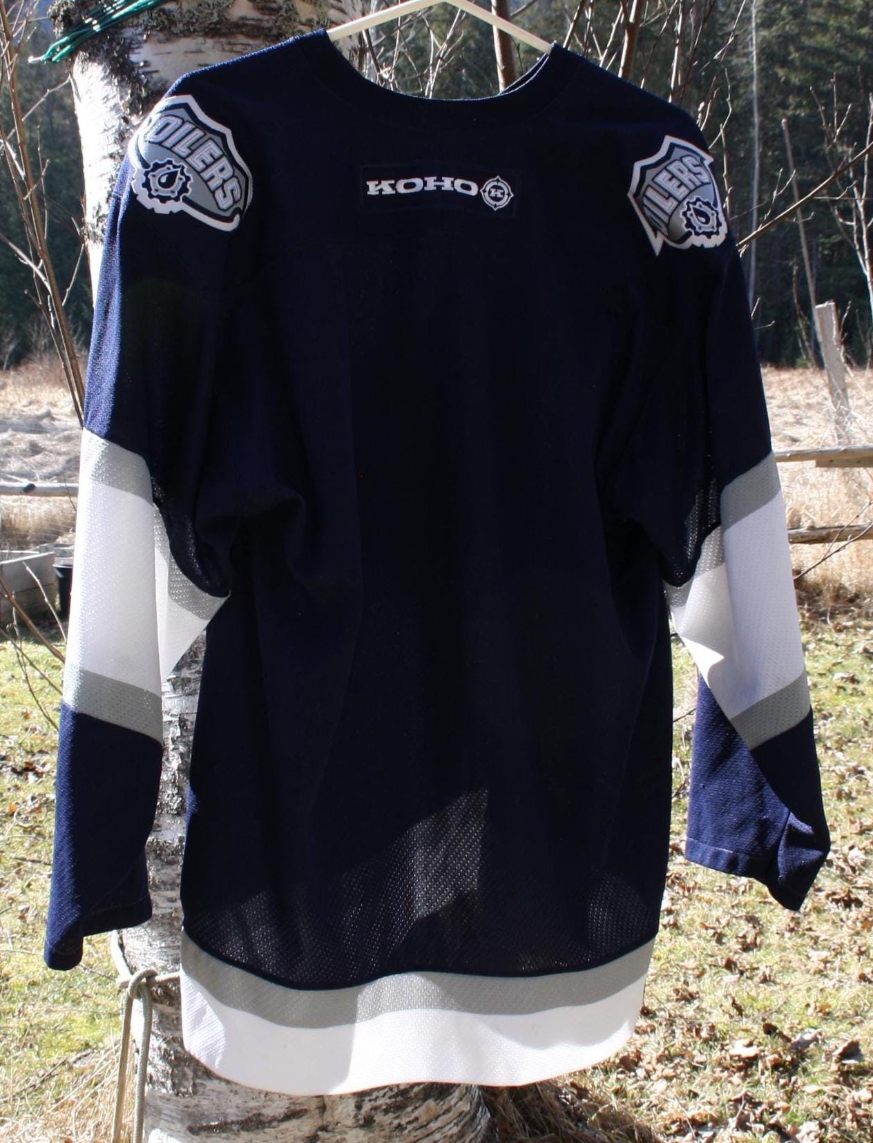 A vintage Edmonton Oilers hockey jersey by KOHO, made in Canada and marked as an official licensed NHL jersey. This is the team’s dark navy alternate design featuring the large silver-and-white “gear/oil drop” front crest, lace-up collar, shoulder Oilers patches, and KOHO rear neck patch.