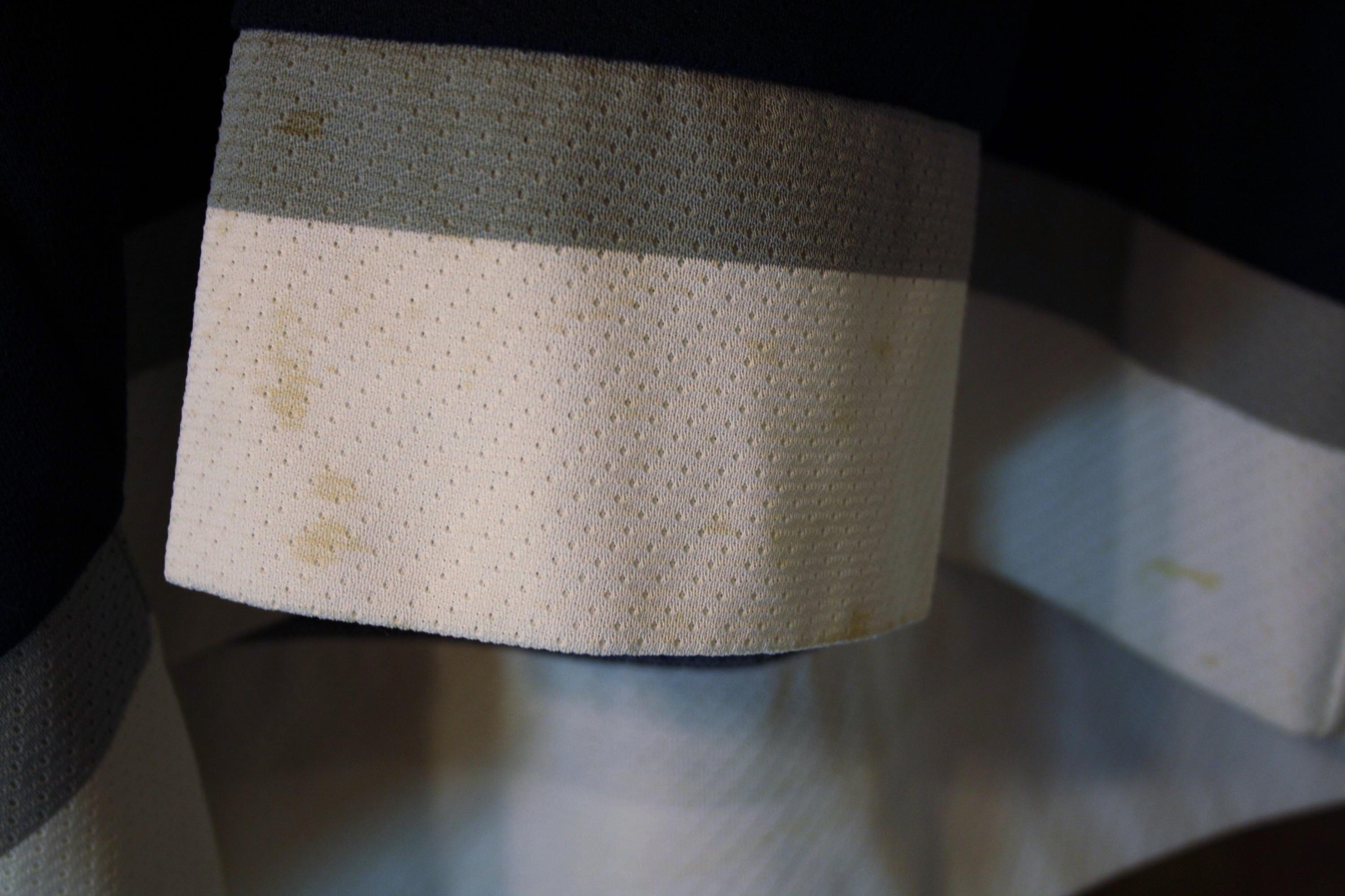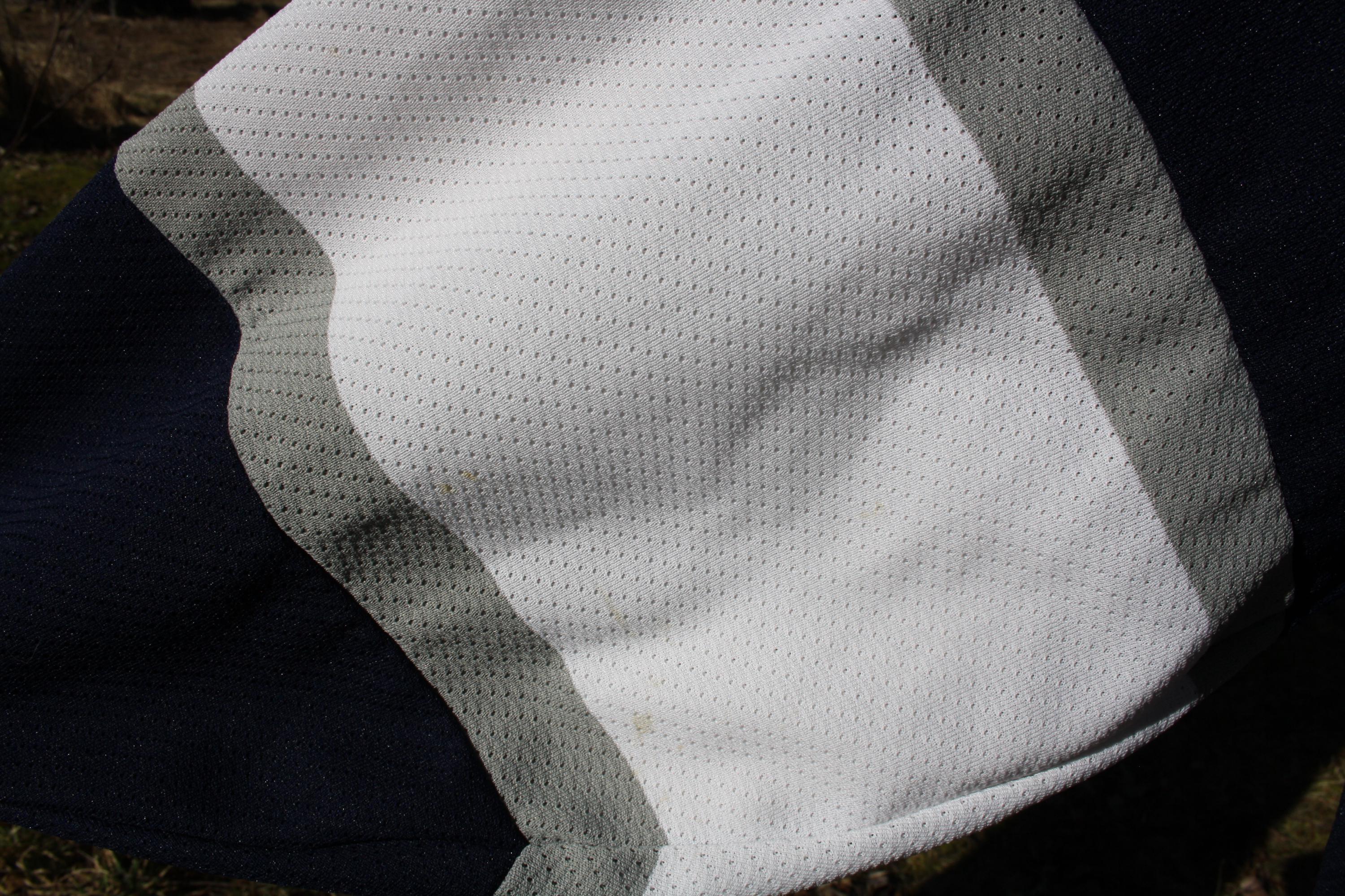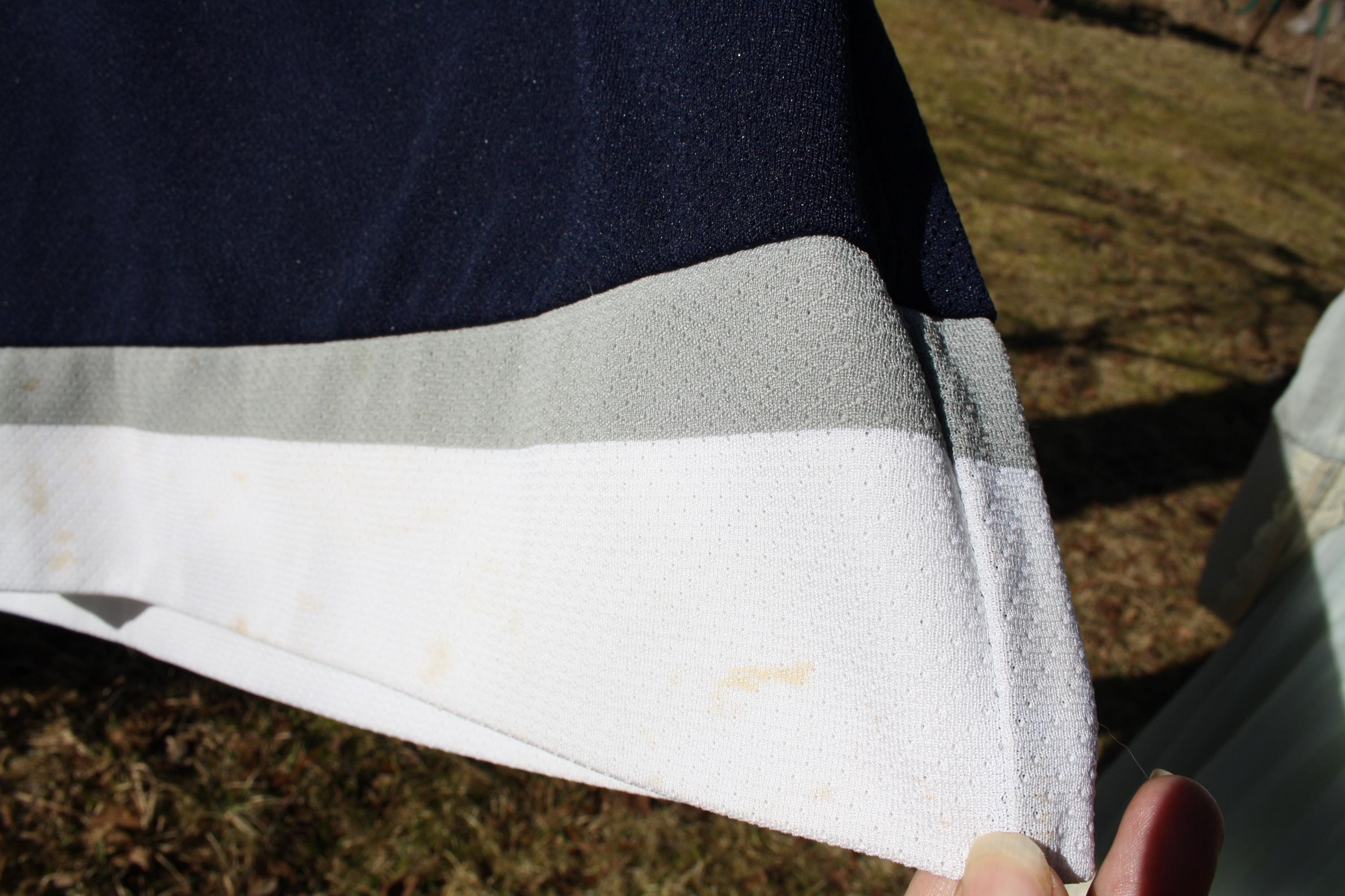 Good vintage condition overall with visible wear from age and use. There are noticeable yellowish stains/discoloration marks along the lower white hem on both front and back, with some additional lighter marks visible in the white sections. No major holes or tears are apparent in the photos provided. Logos, patches, collar, and overall structure appear intact. Sold as found with wear consistent with age, storage, and prior use. Please see photos. Color may differ slightly in real life from how it appears on your screen due to varying monitor settings. Have a question about this item or want to see more photos? Send us a message & we’ll get back to you ASAP!